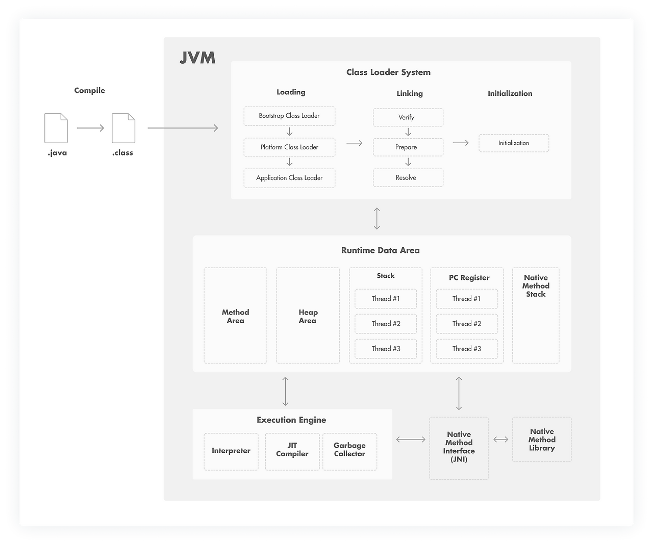 - 인터프리터 또는 JIT 컴파일러를 사용하여 바이트코드를 기계어로 변환해 실행합니다.